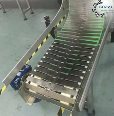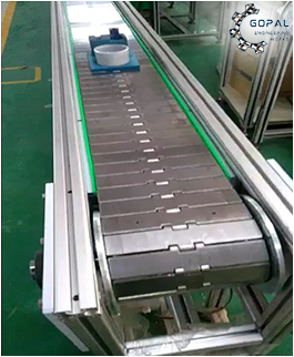 Slat conveyors use a slat and chain system to move components along an assembly line. They are often used where production operations are performed with the parts located on the conveyor. Steel panels are attached to the chain with special chain attachments, and the chain is driven by an electric motor and gearbox.